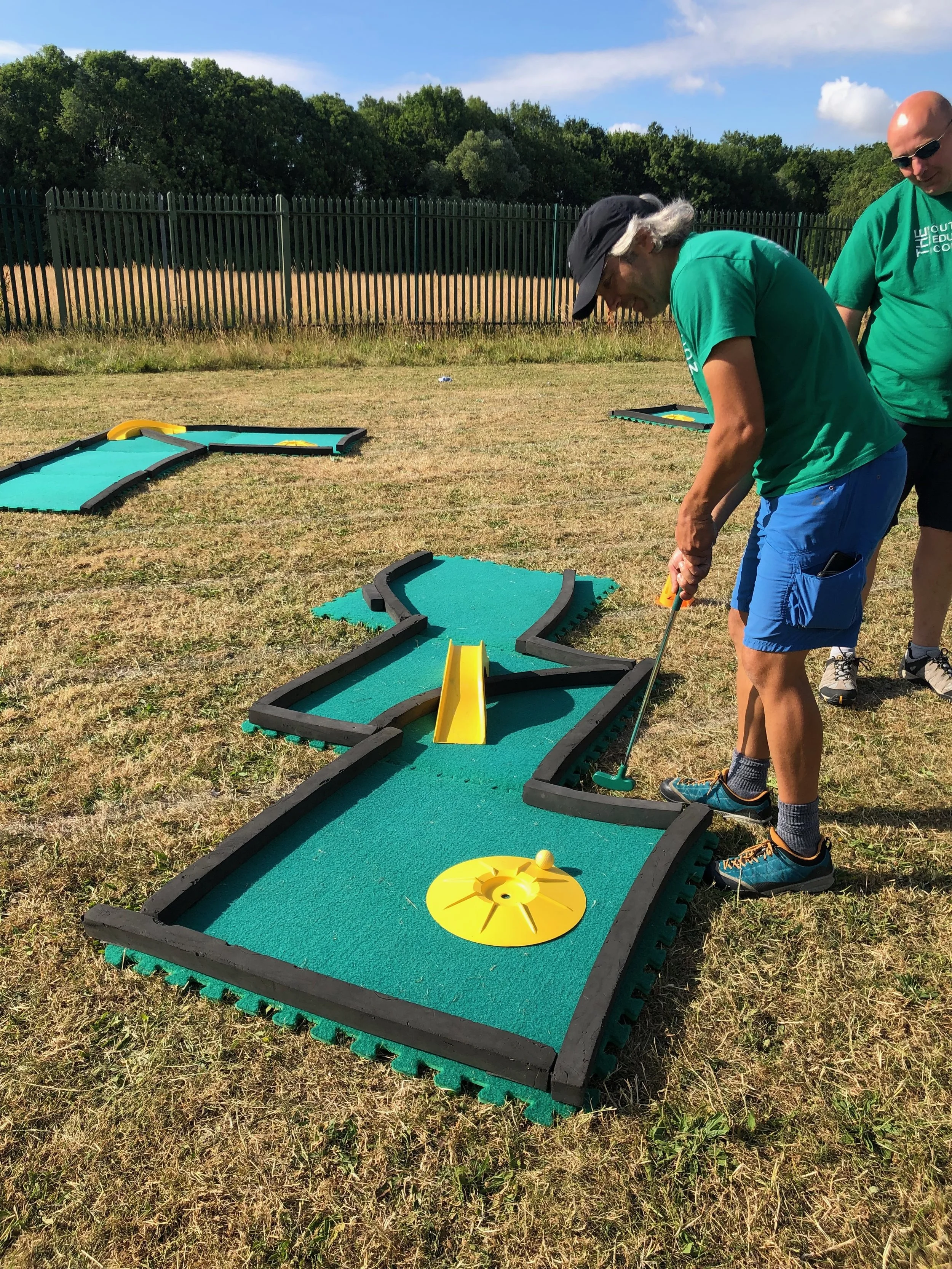Mini golf is played on mats with borders. It can be played from a seated position and we can move borders if needed (to allow wheelchair users better access). Most obstacles are high contrast against the greens.